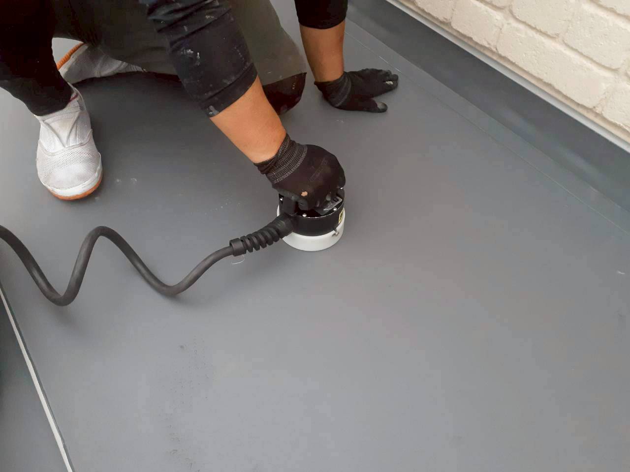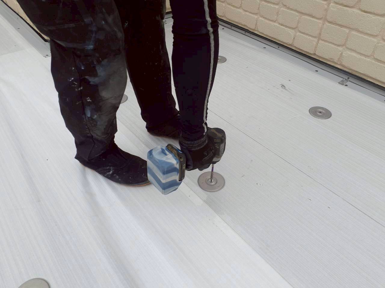 下地に設置したIHディスクに塩ビシートを接合しているところです。機械的固定工法は防水層に穴を開けないでしっかり固定することができます。