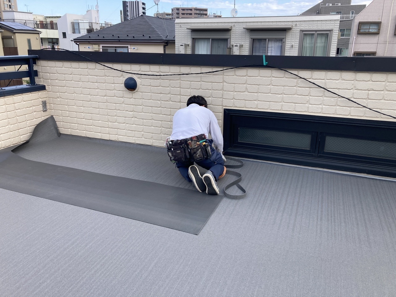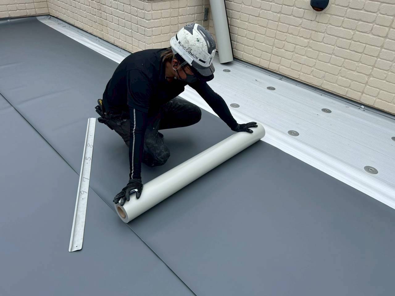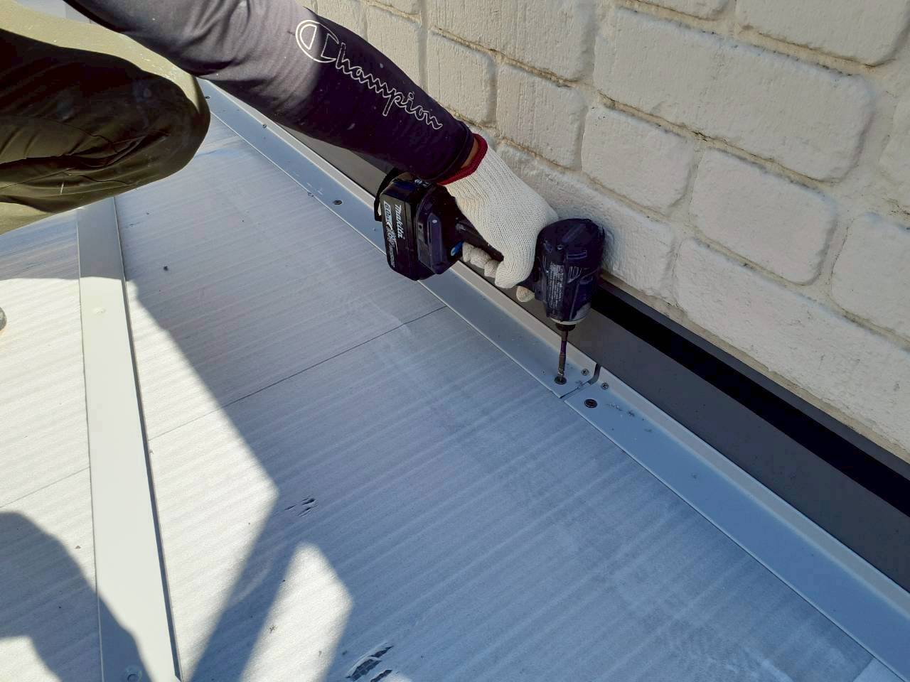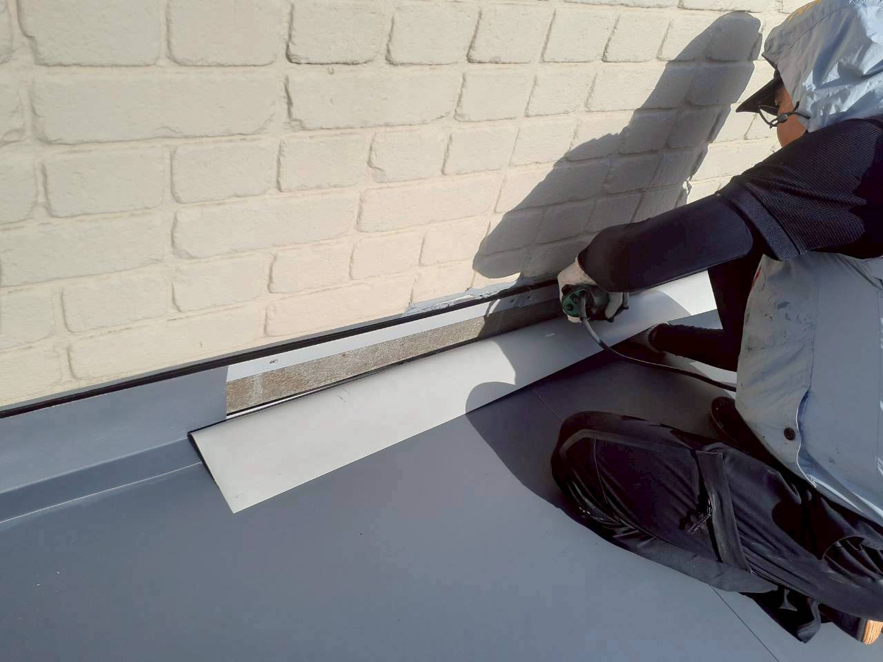 熱風機を使用して立上り部の塩ビ鋼板にシートを溶着しているところです。