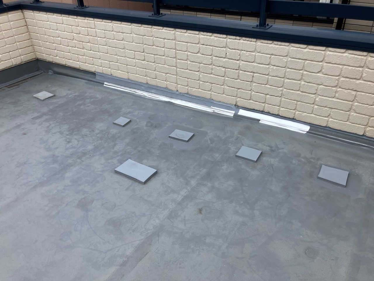 立上り部の既存防水層を撤去後、平場に絶縁シートを敷設して、IHディスクを取り付けているところです。