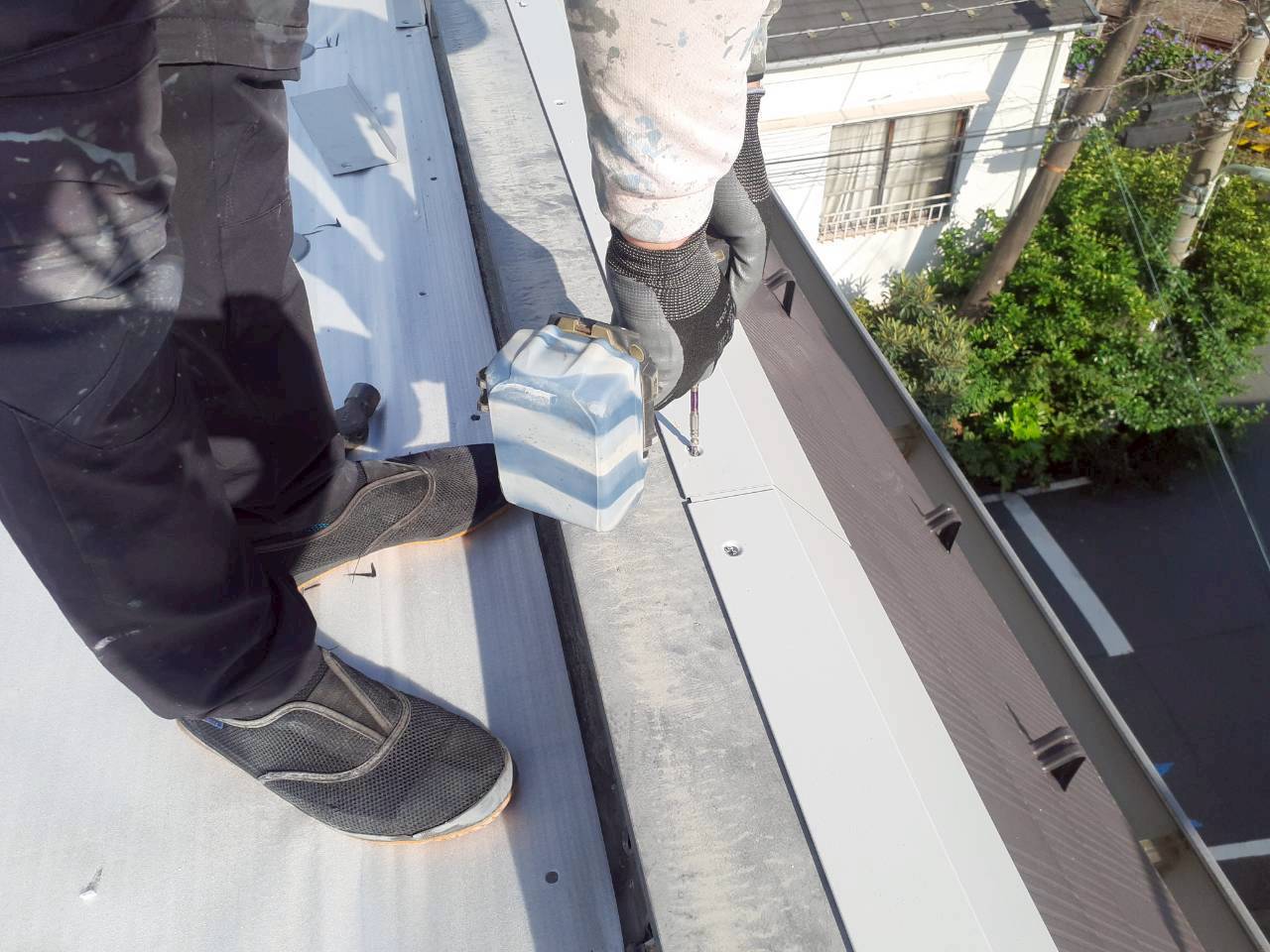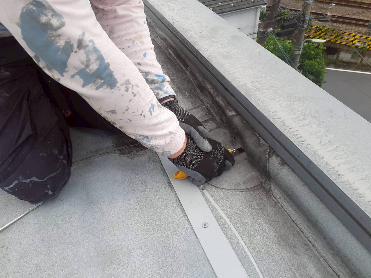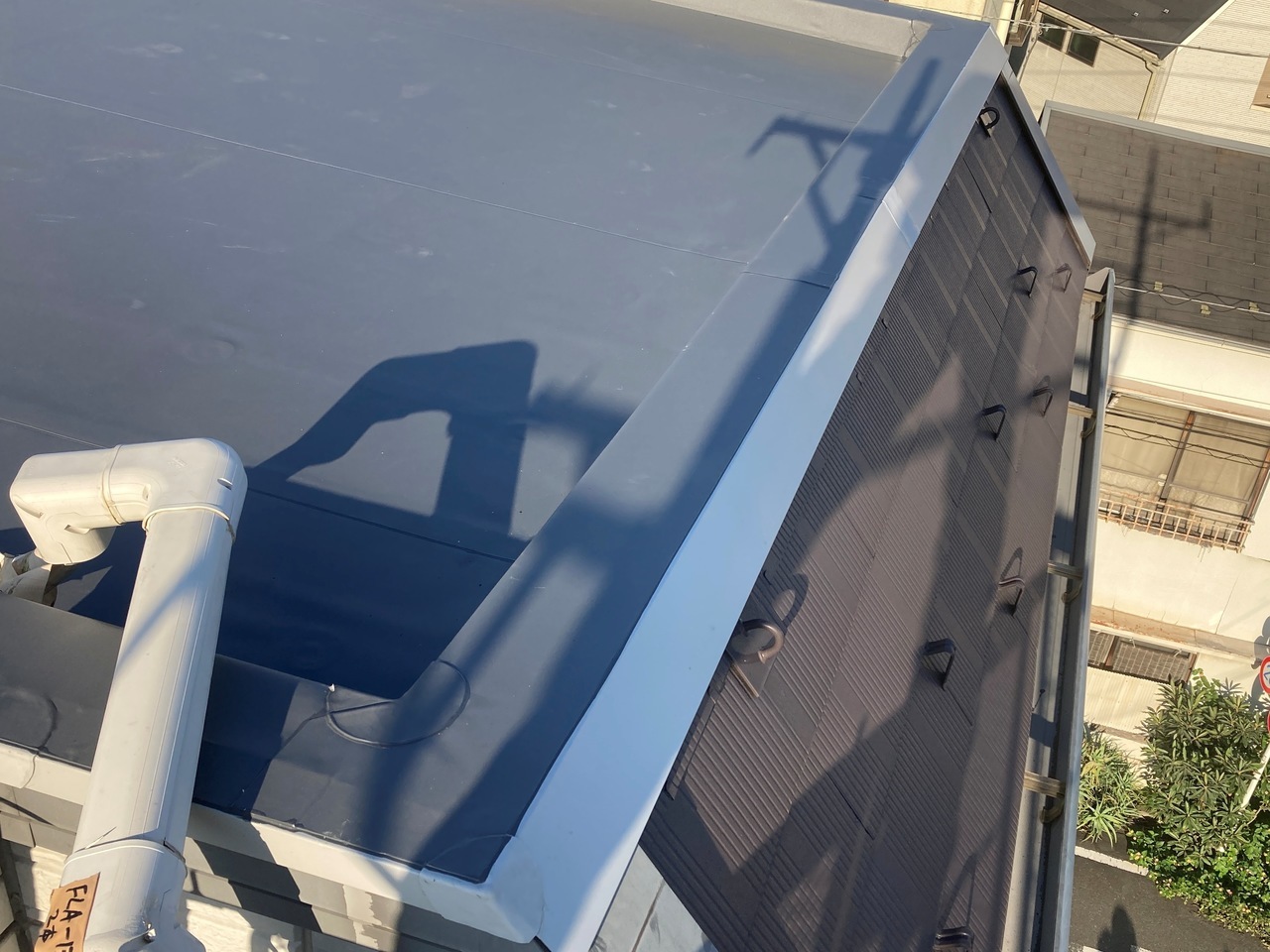 手前の鋼板は、シートをカットしたときに既存シートが動くのを押さえる為に取り付けたものです。
