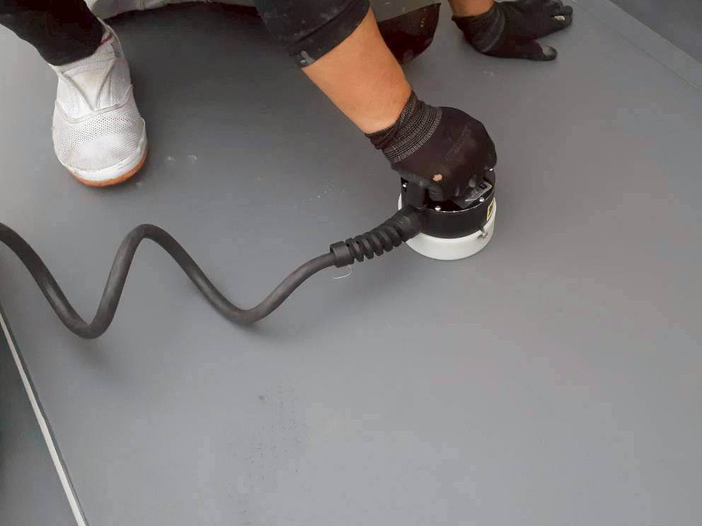 塩ビシート敷設後、IHディスクとシートを誘導加熱装置を使用してディスクを加熱してシートを固定します。