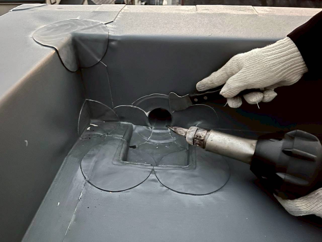 ドレン廻りの防水納めをしているところです。入隅部、出隅部の増し貼りをしてシートの強度を高めます。
