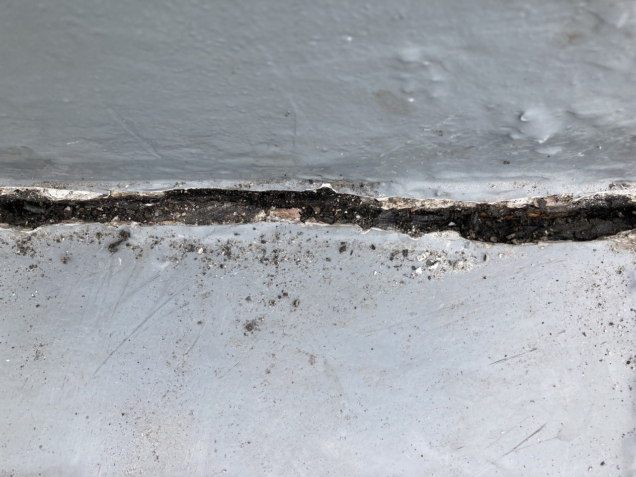 入隅部(床と立上りの取り合い部)は、応力集中が最も発生しやすい箇所であり、適切な処理を行わないと、ウレタン膜が硬化後に割れ・剥離・を引き起こします。これも塗装業者による施工不良です。